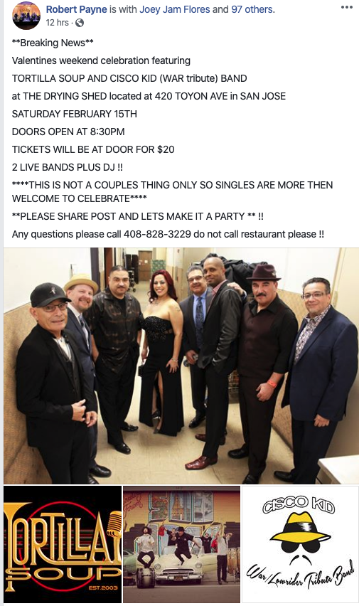 CISCO KID ....... made up of the Bay Areas top musicians led by Recording Artist Drummer/ Vocalist "Joey Jam" Flores, who's band members, including him, have played with The Temptations, Joe Luis Walker, Smash Mouth, Edwin Star, Al Green just to name a few will be taking you down memory lane with all the TOP HITS of the Legendary Band WAR/LOWRIDER...... such as Me and My Baby Brother, Why Can't We Be Friends, Cinco de Mayo, Don't Let Know One Get You Down, Lowrider and of course CISCO KID.